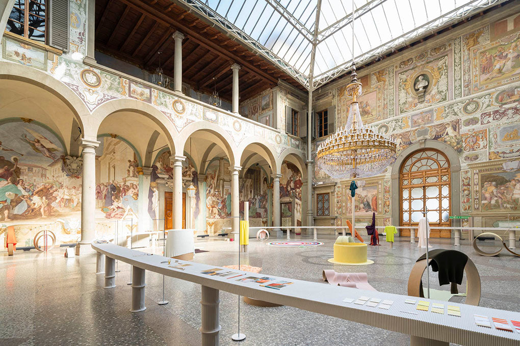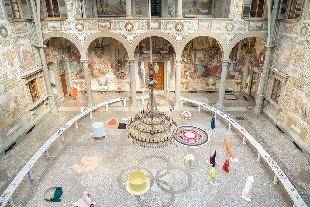 空間全体を巡る大きな円環に並ぶのは、フィレンツェを含むイタリアの都市で行われたフィールドワークによるスタディで実際に使用したアイテム。コレクションにおける色彩、素材、衣服の制作プロセスごとに紐解きます。