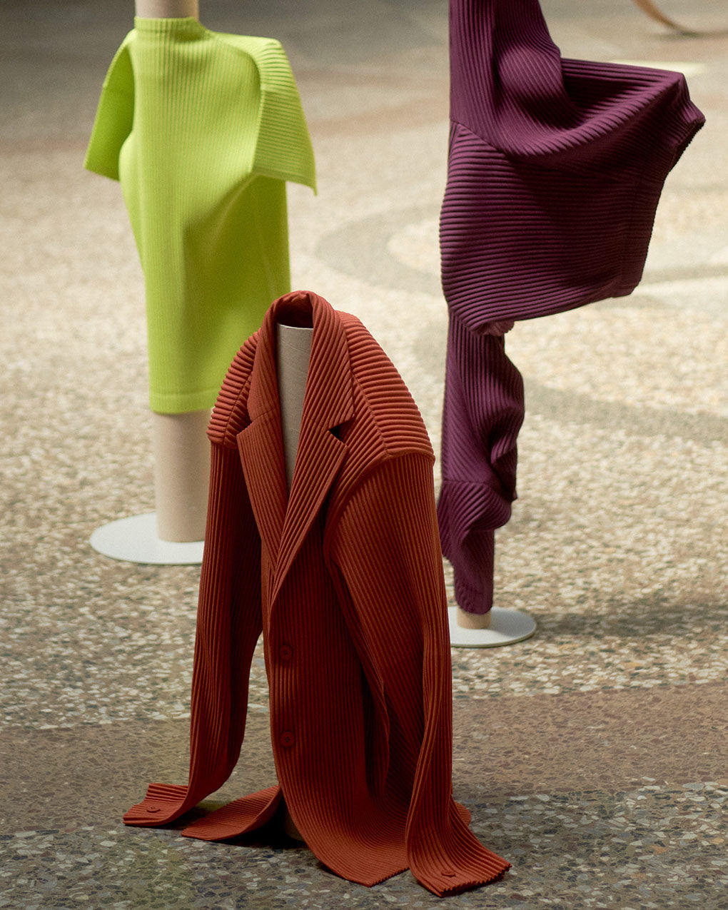 「今回のコレクションはリサーチのプロセスがキーとなっていますが、エキシビションにおいてもHOMME PLISSÉ ISSEY MIYAKEのデザインチームと三澤デザイン研究室が協働し、制作過程をともにしながらつくり上げてきました。普段マテリアルとして布地を扱うことが少ない私たちにとって、プリーツ生地はかたちを自在に変容する魔法のようなマテリアルで、その自由性に夢中になりました。覆う、被せる、巻く、折る、重ねるなどの素材に無理のない自然な手法から生地のなりたいかたちを探求した展覧会です。」