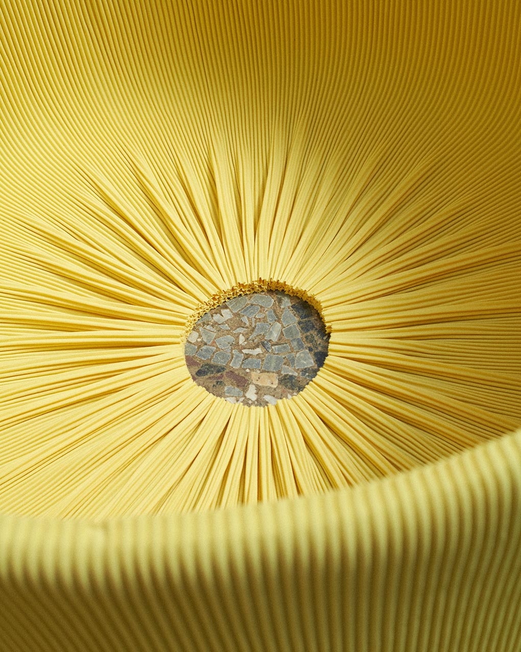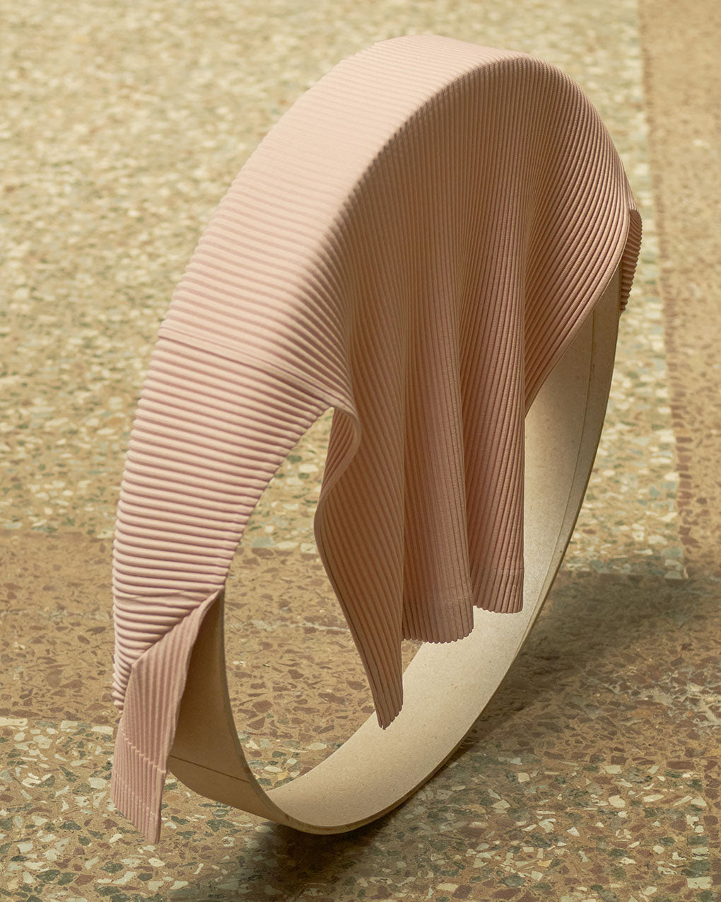 その円環の周りには、コレクションの枠を超えた彫刻のようなオブジェが点在し、プリーツ素材の形態が持つ特性を掴もうとする、実験的な習作が展開されています。そこには、プロセスの中で見出だされた、偶然的で、儚い美しさが表れています。