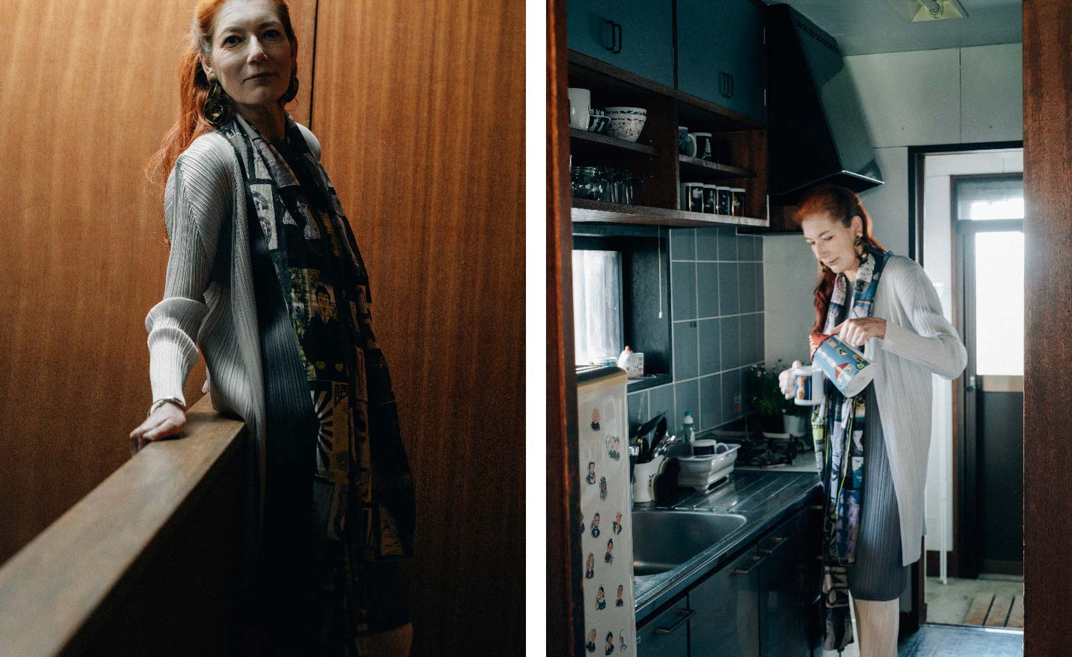 その日は、PLEATS PLEASE ISSEY MIYAKE BASICSのチュニックとロングカーディガンを選んだ。グレーの濃淡を組み合わせ、NEW COLORFUL BASICSの明るいベージュのパンツ。そしてお気に入りの横尾忠則プリントのコットンストール。