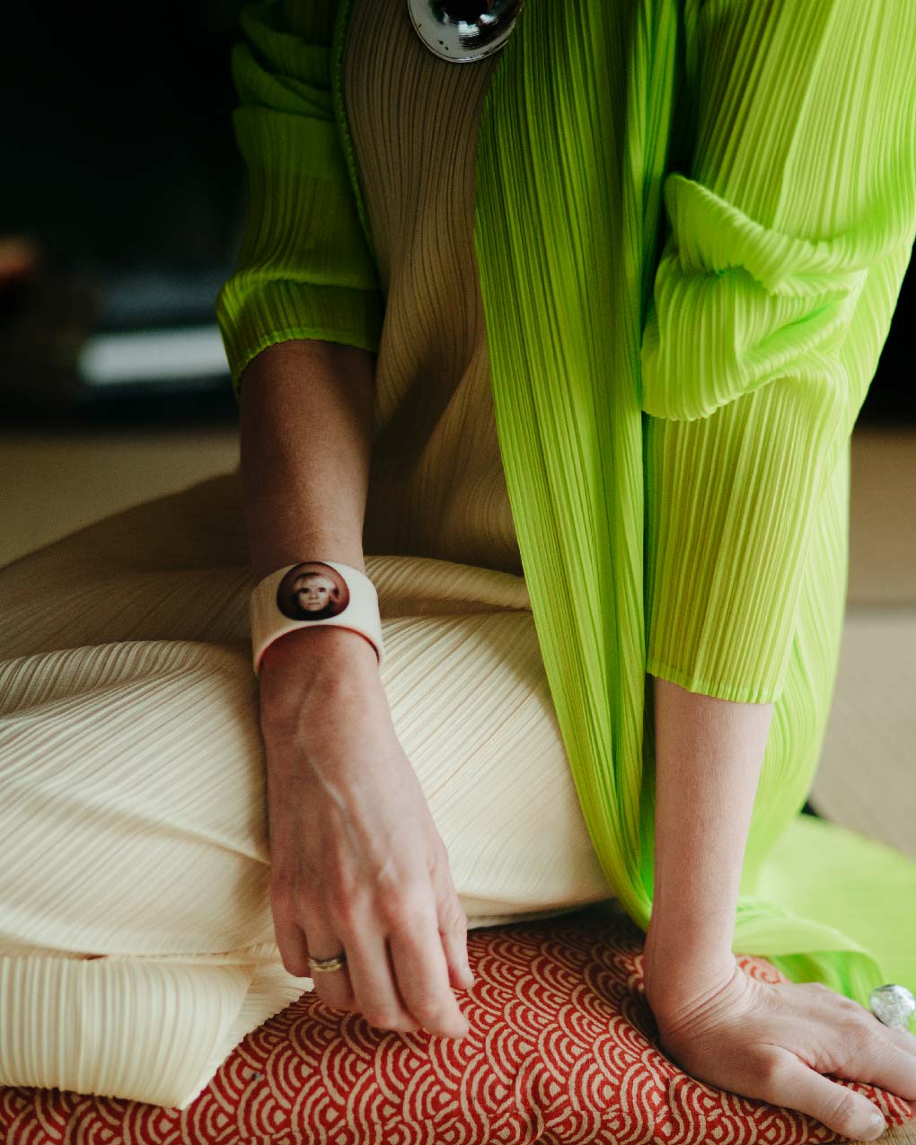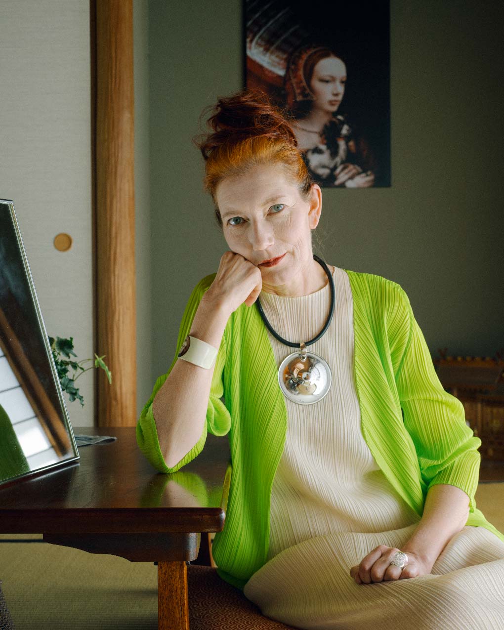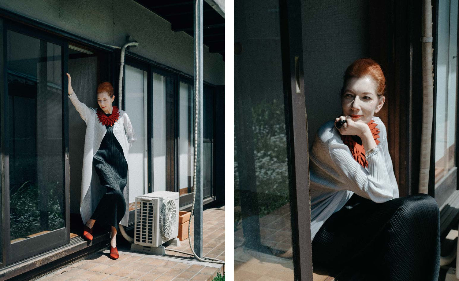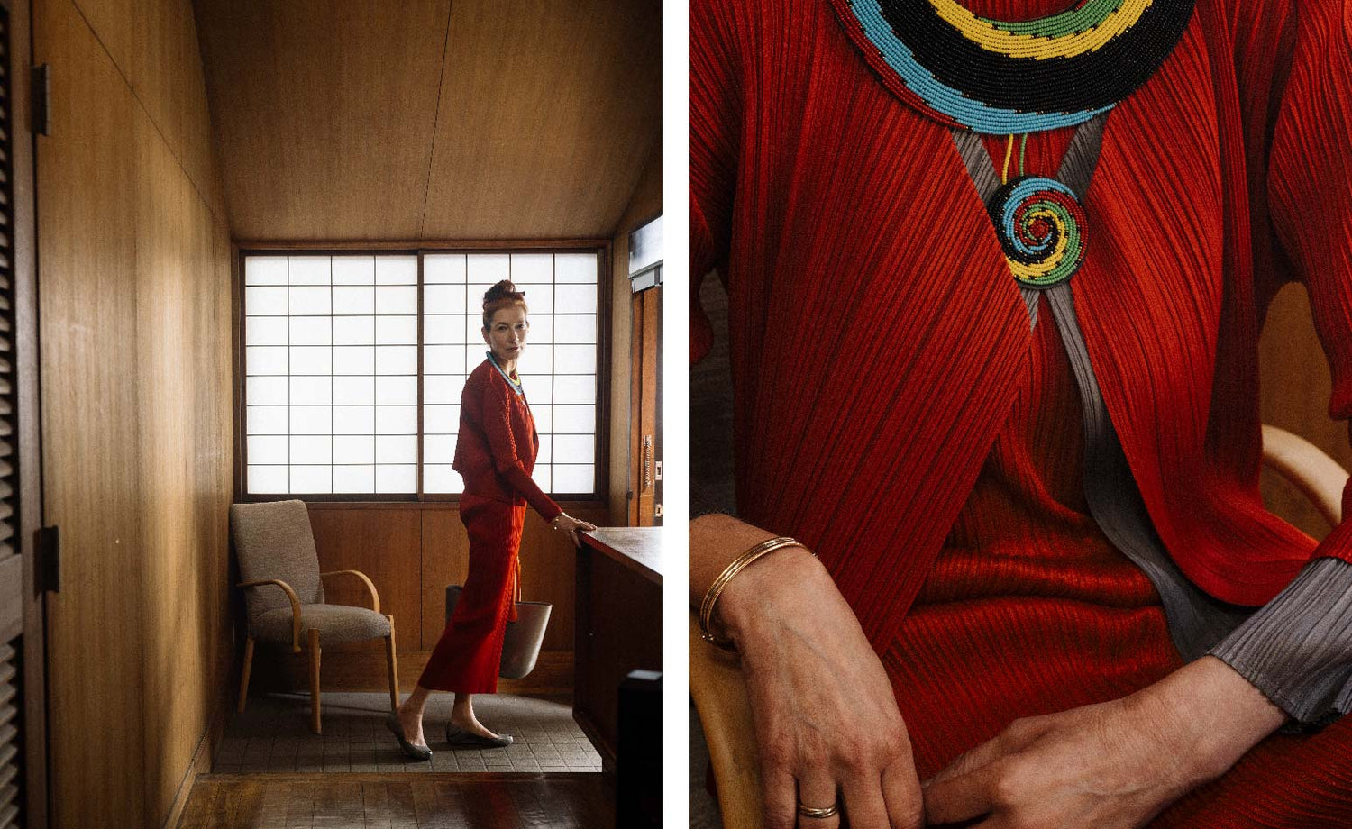 彼女が着ているプリーツ プリーズ。座っているグレーベージュのソファ。ポップな柄のクッション。壁にかかっているカラフルな額装の荒木経惟のスナップ写真作品。すべてが調和し響きあい、いきいきとしている。