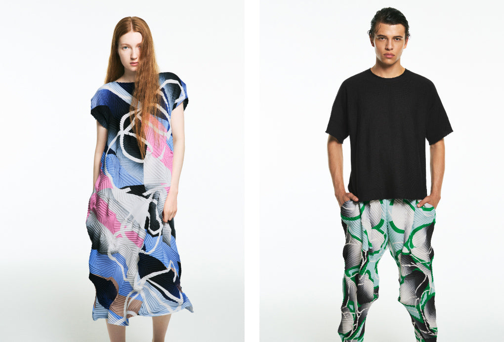 SOAR NYは、独自のプリーツ技法「Baked Stretch」とグラフィックデザインを精緻に組み合わせ、鮮やかな色彩と遊び心あふれるタイポグラフィによるオリジナルモチーフを創出しました。3種類の異なるグラフィックを、ワンピースとパンツのデザインとして展開します。