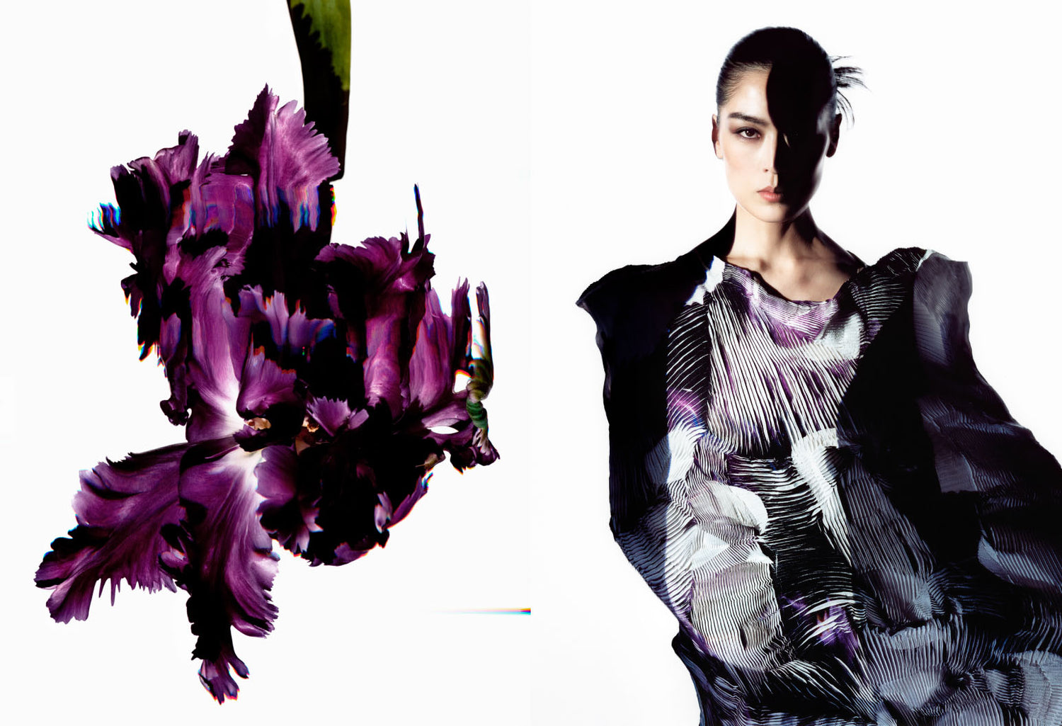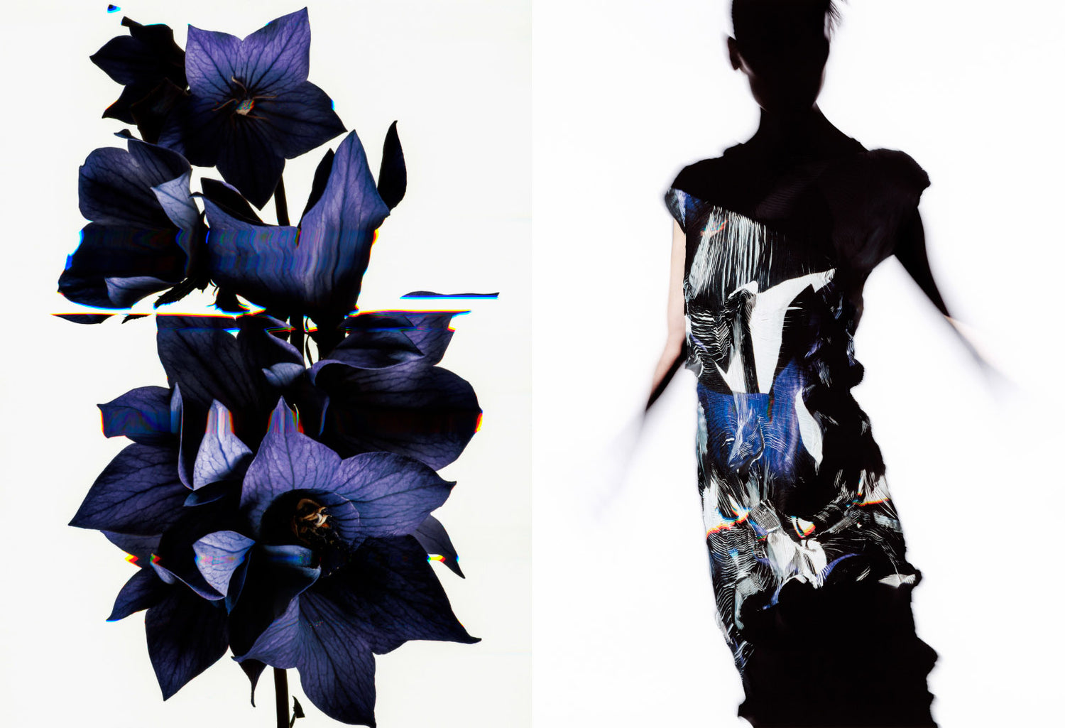 このように考えて私は花の撮影に取り組んできました。花へのアプローチとして、写真を撮るという行為だけにとどまらず、そこからデジタルとアナログの技法の両方を駆使して多層的かつ複合的な花の見方を探求し続けています。花が服の中に生まれ変わり、1人1人の動きによって完成するA-POC ABLE ISSEY MIYAKEの「一枚の布」が、花に向き合い続けてきた私の作品と共鳴して1つの形になることはこの上ない喜びです。今回のコラボレーションの撮り下ろしでは、イッセイ ミヤケの歴史を振り返り、受け継ぎ、発展させ、タイムレスなビジュアルになるよう1枚の写真の可能性に思いを込め、花を撮るように個々の服に宿る美しさを捉えようと試みました。このエネルギーをまっすぐに受け止めてくれたデザイナーの宮前義之さん、チームの皆さんには感謝の気持ちでいっぱいです。