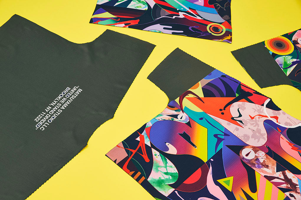 全3作品からなるコートは、松山氏が本プロジェクトのためにさまざまなアートワークを「一枚の布」へ再構築。京都の工房で鮮やかにプリントしたベース生地に、特殊な技法による三角形のパターンをプリントしました。身体の動きに応じて表情が立体的に変化する独自のテクスチャーが特徴です。日常に新たなインスピレーションをもたらすデザインです。