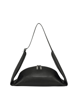 フラットな形から、ファスナーを閉めることで肩掛け、斜めがけの2WAY仕様になるショルダーバッグ。「ものを包んで運ぶ形」を追求するうちに、一枚の木の葉のような形に辿りつきました。表面に樹脂加工をしたスエード調の生地は、使い込むほどに柔らかく馴染んでいきます。使わないときはファスナーを全て開き、丸めて置いておくことも可能です。