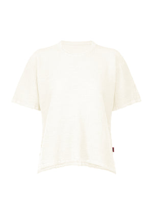 軽くしなやかな肌触りが特徴的なKYO CHIJIMIの丸首半袖トップ。タテ糸とヨコ糸に強撚糸を使用し、産地独自の織機で織り上げています。製品染めによってタテヨコ両方向にシボが入ることで生まれた、ふわっとバウンドするような素材感が特徴です。