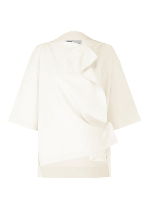 前身ごろに大きなタックをとって生み出したドレープが特徴のトップ。ボタンを外して着用することもできます。テキスタイルには再生ポリエステルを用い、軽やかな風合いを追求しました。