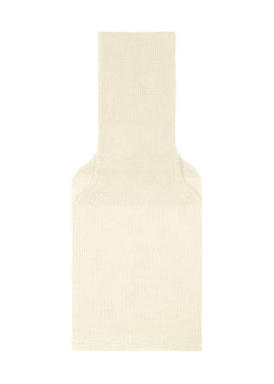 部分的に平面プレス加工を施すことで生まれる、ダイナミックなシルエットが特徴のニットストール。熱可塑性のある合成繊維とウール・アルパカの混紡糸をプレス加工することで、ニットには通常見られないパリッとした硬質な質感とほのかな艶を出しています。パニーニの具を挟むような感覚で、中に型を挟んでプレスしており、何も挟んでいない端部分は編地同士が硬く接合しています。