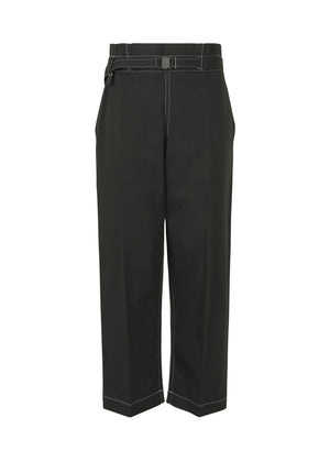 折り目に沿って畳むことで持ち運びがしやすい、再生ポリエステルのデニム生地を使用したストレートパンツ。デニムの微妙な色合いを再現するために、綿(わた)の段階で色をミックスさせて作った再生ポリエステルの原着糸をタテ糸に使用し、仕上げに洗いをかけてリアルなデニムの風合いを出しました。両脇にポケットがあります。
