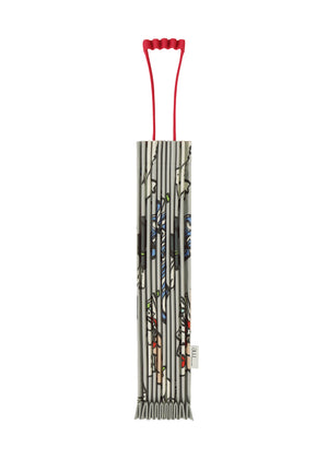 木の幹からインスパイアされた直線的なラインとユニークな持ち手が特徴のトートバッグ。手品の道具をモチーフに、マジックペンで描いた柄をプリントしました。