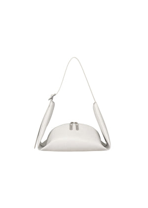 フラットな形から、ファスナーを閉めることで肩掛け、斜めがけの2WAY仕様になるショルダーバッグ。「ものを包んで運ぶ形」を追求するうちに、一枚の木の葉のような形に辿りつきました。表面に樹脂加工をしたスエード調の生地は、使い込むほどに柔らかく馴染んでいきます。使わないときはファスナーを全て開き、丸めて置いておくことも可能です。