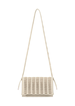 一本の糸から編み上げた、軽くて柔らかいショルダーバッグ。編みの組織や色の組み合わせによってあたたかみのある表情を作りました。編み目に通した紐の結び方を変えることで、フラップ付のショルダー型や縦長のトートバック型など様々な形にアレンジすることができます。