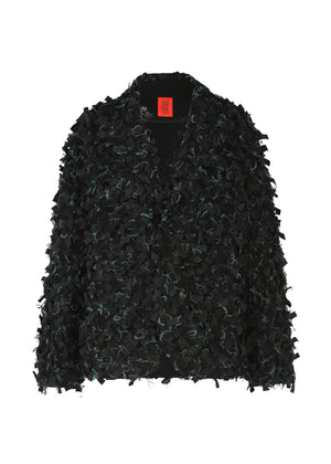 タテ糸にウール糸、ヨコ糸には綿糸、ナイロン意匠糸、テープ状にカットしたブロード生地、ナイロンチュール生地、4色のウール糸の8種を織り込んだ素材を使用したジャケット。ヨコ糸をフリンジ状にカットすることで立体感と迫力のあるデザインに仕上げました。