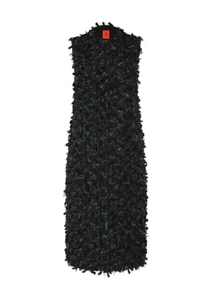 タテ糸にウール糸、ヨコ糸には綿糸、ナイロン意匠糸、テープ状にカットしたブロード生地、ナイロンチュール生地、4色のウール糸の8種を織り込んだ素材を使用したロングベスト。ヨコ糸をフリンジ状にカットすることで立体感と迫力のあるデザインに仕上げました。
