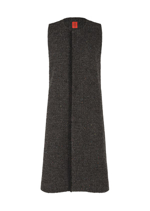 まばらな太さが特徴のスラブ糸、色の節があるカラーネップ糸、ループ糸などの様々な形状と太さの糸をタテヨコに組み合わせた、尾州産のツイード素材のワンピース。ざっくりとした織りと特殊な加工により、柔らかな風合いに仕上げました。同色のカラーネップ糸を使用したフリンジがアクセントになっています。