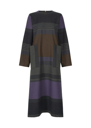 タテ糸に綿麻の混紡糸1色、ヨコ糸に6色(ウール糸1色、シルクノイル糸2色、綿麻糸1色、綿スラブ糸2色)を使用し、ジャカード織りでボーダーの幅や織組織、素材を組み合わせた生地の長袖ワンピース。毛織物産地として発展してきた尾州産の生地を使用しました。シルクノイル糸は、まゆから生糸を製糸した後のわたをつむいだもので、 サラサラしたシルクサテンとは異なる独特の凹凸感が特徴です。