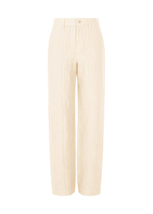 ラッセル編みを施したジャージー素材のパンツ。綿糸にナイロン糸を合わせて編むことで、染色時の伸縮差により立体感のある凹凸が生まれました。