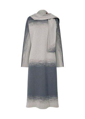 かすり染めの糸と単色染めの糸を段毎に差し込むことでグラデーション状のかすりを表現したジャージー素材のワンピース。裏面にポリエステル糸を使用することで、適度な張り感と弾力のある生地に仕上げました。同素材のフードマフラーが付属しています。