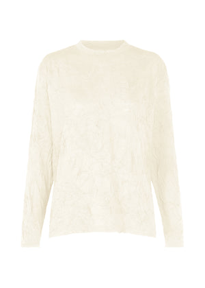 ポケットが付いた丸首長袖トップ。染色時に高温ウォッシャーによるシワ付け加工をしたポリエステルとウールのジャージー素材です。