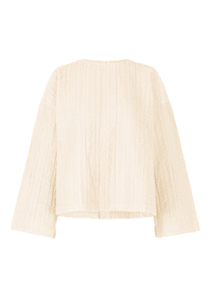 ラッセル編みを施したジャージー素材の長袖トップ。綿糸にナイロン糸を合わせて編むことで、染色時の伸縮差により立体感のある凹凸が生まれました。