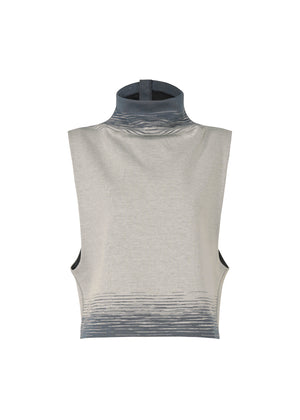 かすり染めの糸と単色染めの糸を段毎に差し込むことでグラデーション状のかすりを表現したジャージー素材のノースリーブトップ。裏面にポリエステル糸を使用することで、適度な張り感と弾力のある生地に仕上げました。
