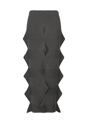 リブ組織の引き返し編みの技法を応用しジグザク状の編地を作り出したスカート。オーストラリア産の羊毛にブライトナイロンをブレンドした、シャリ感と弾力のある糸を使用しています。