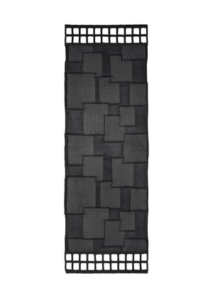 オーガニックコットンとリサイクルポリエステルを細番手で紡いだ糸を使用した大判ストール。ハイゲージの3種類の透かし編みをパッチワーク風に配置し、端は四角の穴あきレースにすることでジオメトリックなデザインに仕上げました。