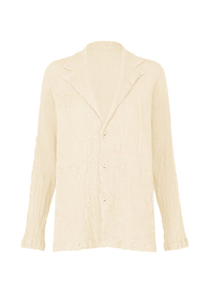 軽くしなやかな肌触りが特徴的なKYO CHIJIMIに、太さに表情のあるガラ紡糸を用いて刺繍を施したテーラードジャケット。ふっくらとした手紡ぎのような素朴な風合いの糸で曲線の刺繍を施し、質感や立体感を出しました。