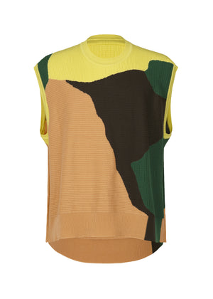 華やかな柄が目を引く丸首ニットベスト。石が作り出す自然な模様の美しさから着想した柄を、インターシャ機で時間をかけて丁寧に編み立てました。オリジナルで染め上げた糸を使用し、色によって編み組織を変えることで、石の断面のような不思議な柄が生まれます。