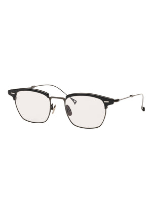 普通の形に見えながら、リム全体の大きさ、ブリッジ周りの形状にこだわったクラシックな味付けが特徴の「BONE SERIES VIII」をベースに、上部に太めのアセテートパーツを配し、精悍な印象に仕上げました。