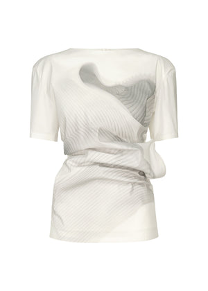 服と芸術を結びつけるアプローチから着想を得た丸首半袖トップ。ニットシリーズの「KNIT (AS IT IS)」を高画質で撮影した写真を、最新の転写技術を用いて衣服にプリントしています。柄のドレープやシルエットが、実際の衣服のドレープやシルエットと重なったり重ならなかったりすることで、まるで立体と平面を行き来するような感覚を持ち合わせます。身体にぴったりと沿うデザインで、着用することで柄が立体的に浮かび上がります。