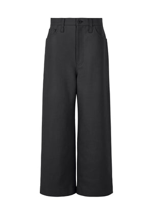 断ち切り部分をそのまま生かした、あえて完成していない美しさを表現したパンツ。ウールで編み立てた厚手の圧縮ジャージーに樹脂コーティング加工を施し、加圧プレスをすることで厚紙のようなハリのある風合いが生まれました。生地端を断ち切りのまま使用している部分があります。
