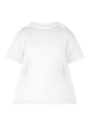 中綿入りの丸首半袖トップ。46Gの超高密度で編み上げたストレッチジャージー素材の間に中綿シートを挟むことで、むくむくとしたユニークなフォルムと柔らかな着心地を実現しました。ベーシックなシルエットでありながら、中綿が入ることで存在感のある仕上がりになっています。