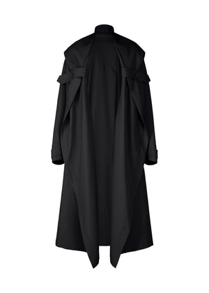 肉厚でありながらも軽く柔らかく、光沢のある布地で、ゆったりとしたコクーンシルエットが特徴のコート。前端から衿にかけて続く一枚の布を基にしています。衿部分をフードとして着用したり、身頃についているタブや、前端のループのかけ方を変えることで、様々な着方を楽しむことができます。