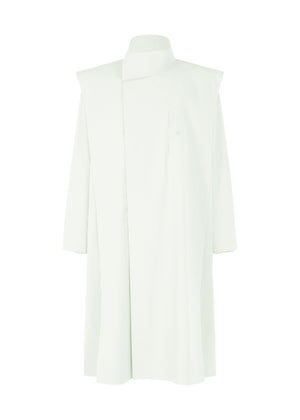 ペーパーライクなストレッチ糸で織り上げた、やわらかな布地を使用したロング丈のシャツ。本来は内側にくる見返し部分をあえて外側にデザインし、動くたびに揺れる軽やかな動きと、しなやかな表情が特徴です。