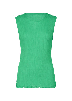 ヨコ糸に強撚糸を織り込んだ生地を使い、製品染めをしたシースルークレープのノースリーブトップ。染色工程でヨコ糸の撚が戻ることで縦にシボが入り、楊柳独特の表情が生まれます。