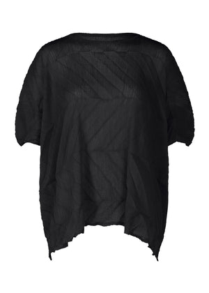 ヨコ糸に強撚糸を織り込んだ生地を使い、製品染めをしたシースルークレープの半袖トップ。染色工程でヨコ糸の撚が戻ることで縦にシボが入り、楊柳独特の表情が生まれます。製品染めをした後にジグザグとしたハンドプリーツ加工を施し、立体感のあるテクスチャーに仕上げています。