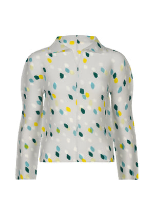 縦と横にプリーツのかかった、伸縮性があるストレッチプリーツの襟付き長袖トップ。描く時間を色ごとに設定し、その時間内に描かれたドットの柄です。