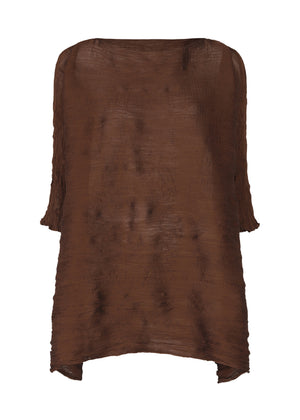 ヨコ糸に強撚糸を織り込んだ生地を使い、製品染めをしたシースルークレープの半袖チュニック。染色工程でヨコ糸の撚が戻ることで縦にシボが入り、楊柳独特の表情が生まれます。シャンブレーのような深みのある色と、ツイスト加工を施した表情豊かなテクスチャーが特徴です。