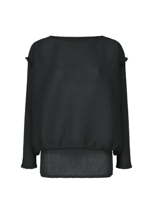 ヨコ糸に強撚糸を織り込んだ生地を使い、製品染めをしたシースルークレープの長袖トップ。染色工程でヨコ糸の撚が戻ることで縦にシボが入り、楊柳独特の表情が生まれます。タテ地とヨコ地を接ぎ合わせたリブのようなデザインによって、ブラウジングすることでシルエットの変化を楽しむことができます。