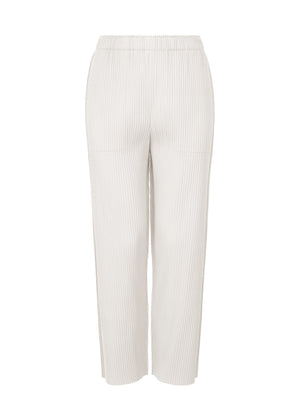ストレッチ性のある細くやわらかな糸で編んだニットにプリーツ加工を施した、軽量でソフトな肌触りが特徴的なファインニットプリーツのストレートパンツ。両脇にポケットがあります。