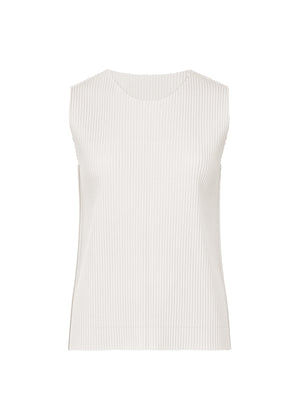 ストレッチ性のある細くやわらかな糸で編んだニットにプリーツ加工を施した、軽量でソフトな肌触りが特徴的なファインニットプリーツの丸首ノースリーブトップです。