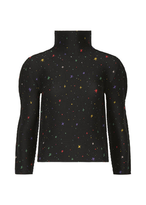 縦と横にプリーツのかかった、伸縮性があるストレッチプリーツのハイネック長袖トップ。夜空に輝く星をカラフルに描いた柄です。