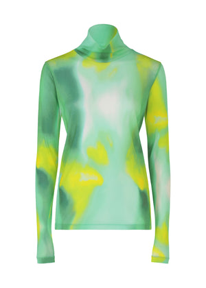 カラーホイルを歪ませて撮影した写真によって、幻想的で美しいオーロラを表現した柄のナイロンチュールのハイネック長袖トップ。袖にサムホールのあるデザインです。