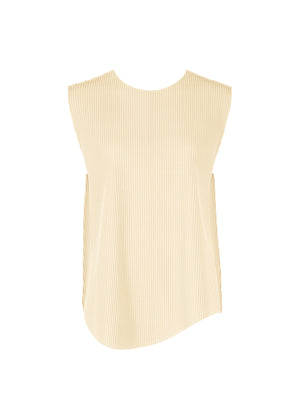 ストレッチ性のある細くやわらかな糸で編んだニットにプリーツ加工を施した、軽量でソフトな肌触りが特徴的なファインニットプリーツのノースリーブトップ。波打つような裾のカットラインやドレープのあるシルエットで、神秘的で美しいオーロラの揺らめきを表現しました。同素材のアイテムを重ねてコーディネートすることで、奥行きのある色の重なりが生まれます。