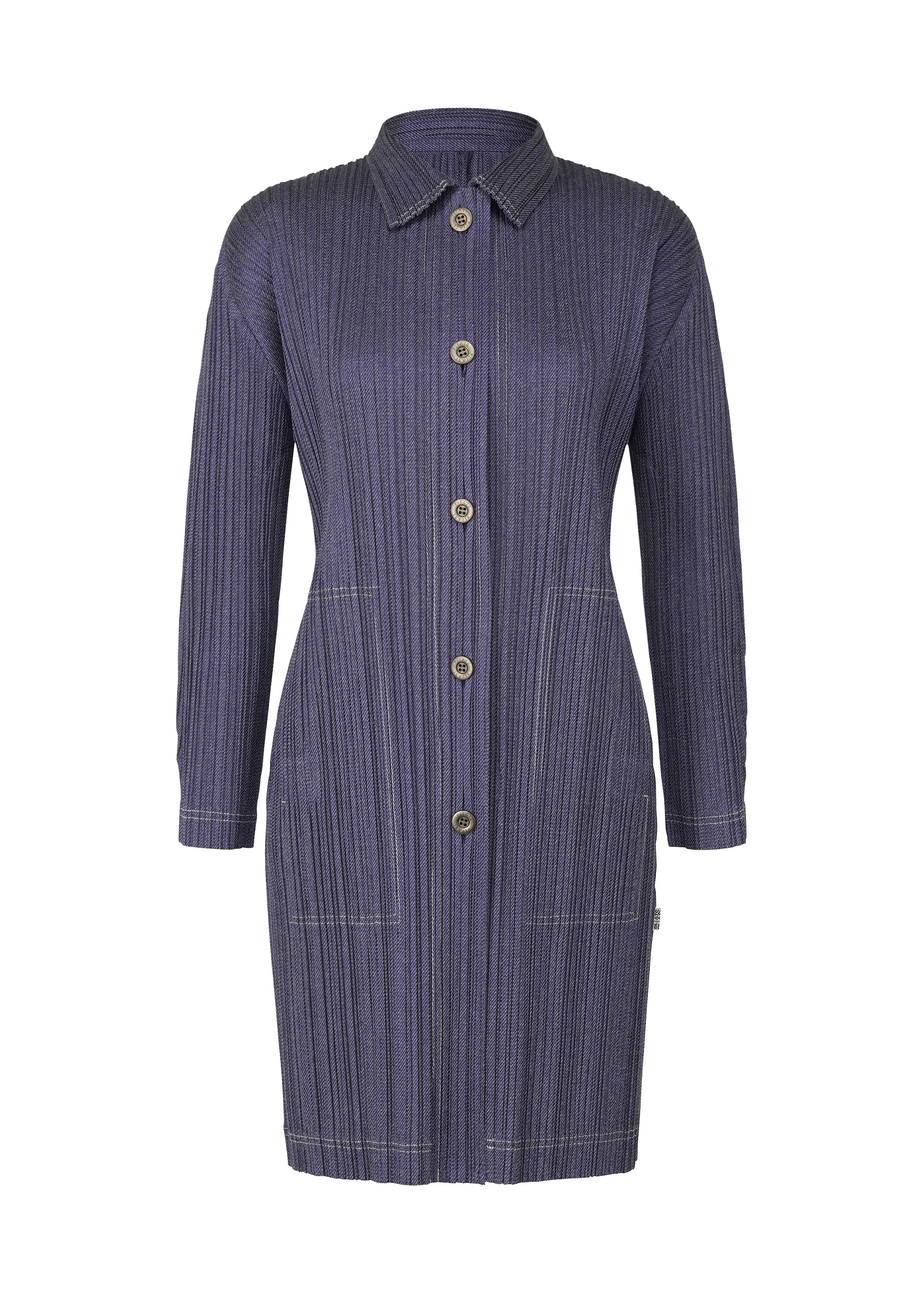 コットンを取り入れたテキスタイルでデニムらしさを追求したシリーズの襟付き長袖ロングコート。アクセントとなるカラーでステッチを入れています。ボタン仕様で、両脇にポケットがあります。
