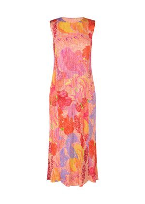春の山に立ち込める霞によって、風景がぼんやりと見える様子をイメージしたプリントの丸首ノースリーブのフレアワンピース。花びらのような丸みを帯びた形が特徴的です。点描写のグラデーションが、山の中にいる植物を表現しています。