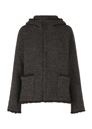まばらな太さが特徴のスラブ糸、色の節があるカラーネップ糸、ループ糸などの様々な形状と太さの糸をタテヨコに組み合わせた、尾州産のツイード素材のフード付きジャケット。ざっくりとした織りと特殊な加工により、柔らかな風合いに仕上げました。同色のカラーネップ糸を使用したフリンジがアクセントになっています。