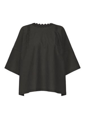 タテ糸に細い絹糸を、ヨコ糸にナイロンとポリエステルのストレッチ糸を入れ生地に細かい凹凸の立体感を出した、軽やかな素材の半袖トップ。歴史ある織物産地である山梨で、高密度に織られたチェック柄です。軽やかさが引き立つゆったりとしたシルエットと、ピンタックや三角形の装飾が特徴です。