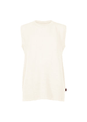 軽くしなやかな肌触りが特徴的なKYO CHIJIMIの丸首ノースリーブトップ。タテ糸とヨコ糸に強撚糸を使用し、産地独自の織機で織り上げています。製品染めによってタテヨコ両方向にシボが入ることで生まれた、ふわっとバウンドするような素材感が特徴です。